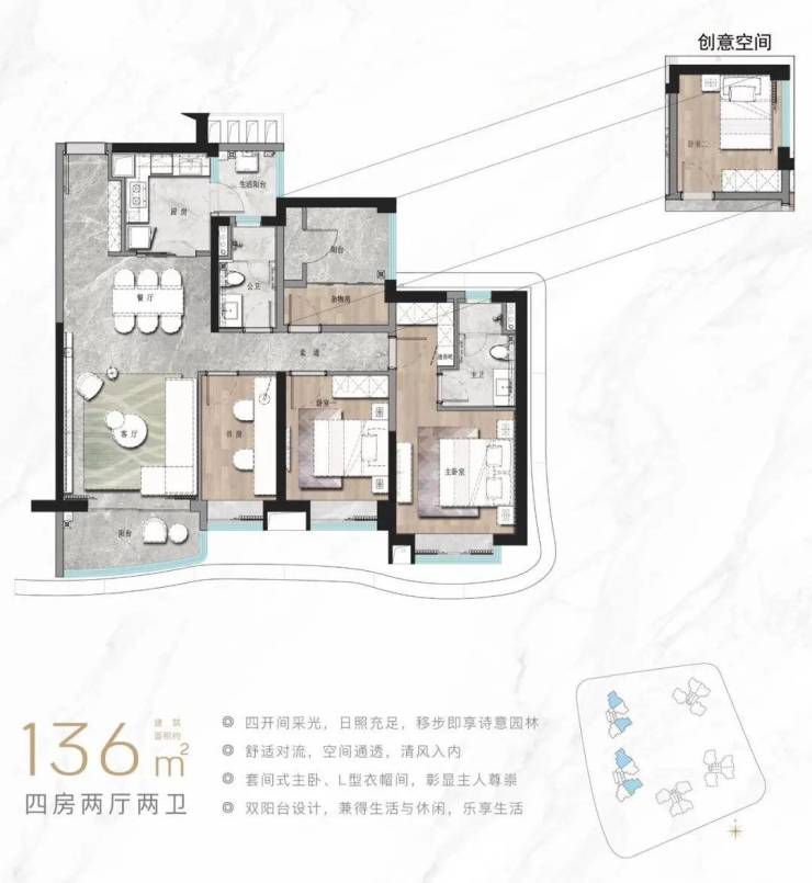 135㎡王牌四房:东南向设计,双阳台连接景观飘窗,主卧配备独立卫浴及观景窗,得房率83%,适合多代同堂或二胎家庭;