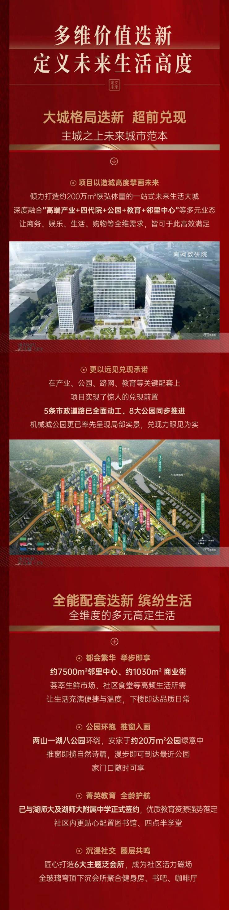 项目已签约引入湖南师范大学附属12年一贯制公办教育体系,规划配建4所幼儿园、1所小学、1所九年一贯制学校。其中,九年一贯制学校已完成主体结构建设,预计2026年6月完成竣工验收,2026年9月正式开学。学校师资由湖师大本部骨干教师领衔,教学质量对标全国百强高中,可提供优质学位超5000个。