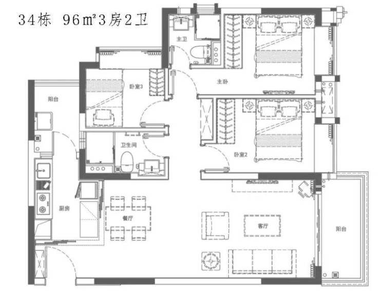 96㎡三房:U型厨房预留双开门冰箱位,主卧1.8米飘窗提升收纳与舒适度;