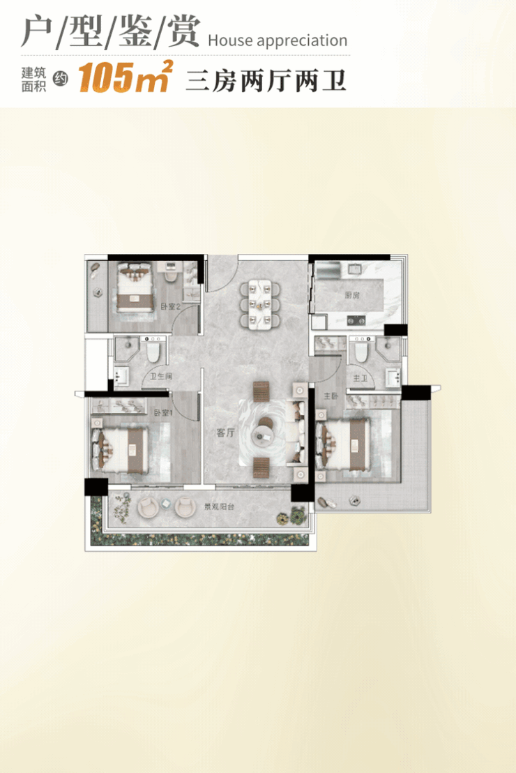 105㎡三房:紧凑高效,户户朝南,采光通风俱佳。