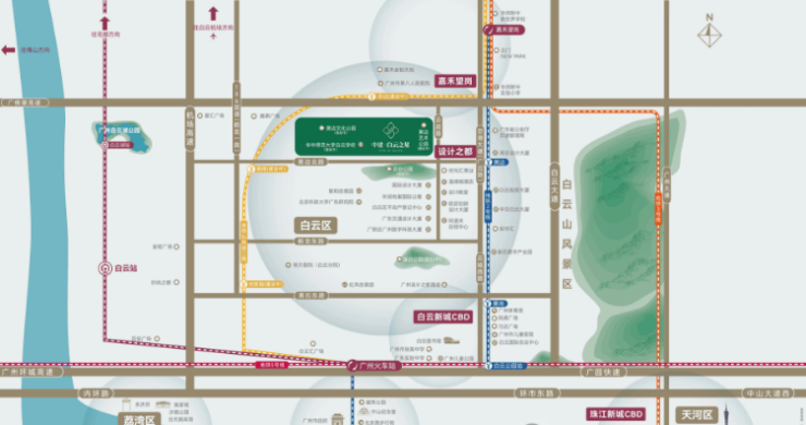 从宏观视角来看,中建·白云之星所处的设计之都板块,正处于广州城市发展的风口浪尖。它是白云发展主轴的核芯位置,是连接白云新城、嘉禾望岗、白云湖三大板块的关键纽带。这种独特的地理位置,赋予了项目极高的战略价值。