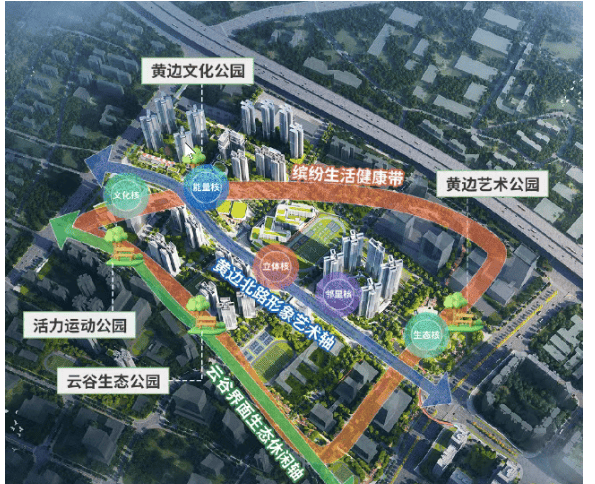 项目紧邻建设中的黄边艺术公园——以莫奈画作为灵感,打造约2.6万㎡的“都会森意”空间,包含三大主题花园、4000㎡阳光草坪、300米中轴通廊及睡莲水景。未来还将与活力运动公园(规划乒乓球、篮球等场地)、云谷生态公园(亲子、慢跑、棋牌)及黄边文化公园连成一体,形成约百亩级的城市绿肺。这种“公园里的家”模式,不仅提升居住舒适度,更重塑了人与自然的关系。每天推窗见绿、下楼入园,四季皆景,生活回归诗意。