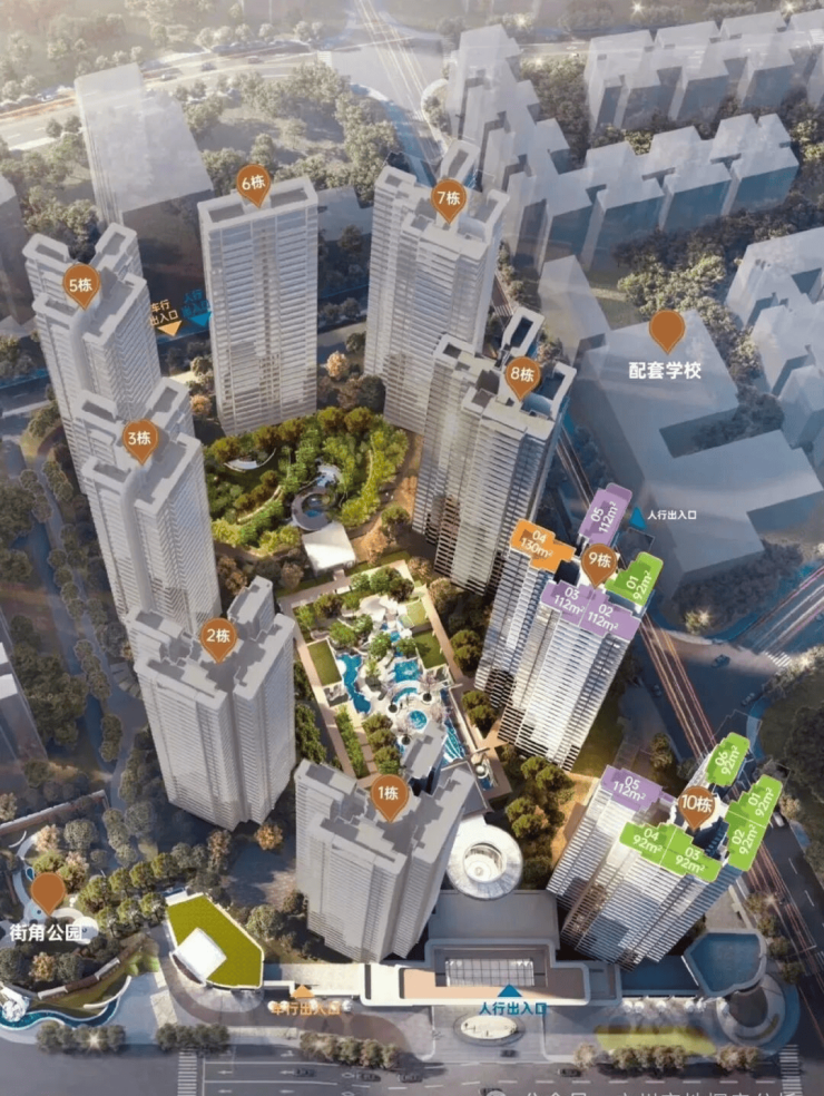 A: 项目主力户型为92-130平方米的三至四房,以及160-170平方米的大平层。大部分户型为全南向设计,采光通风良好。梯户比方面,9栋为2梯5户,10栋为3梯6户,部分板楼户型为专梯入户。