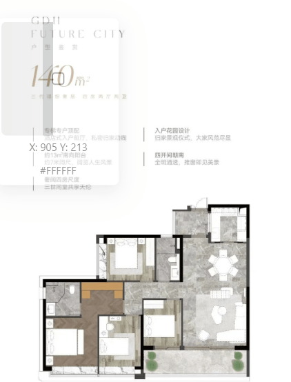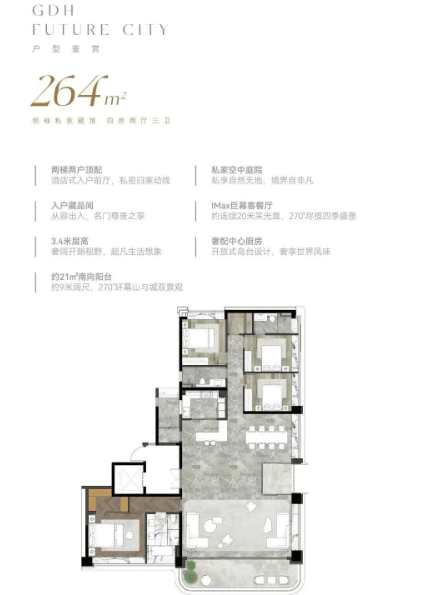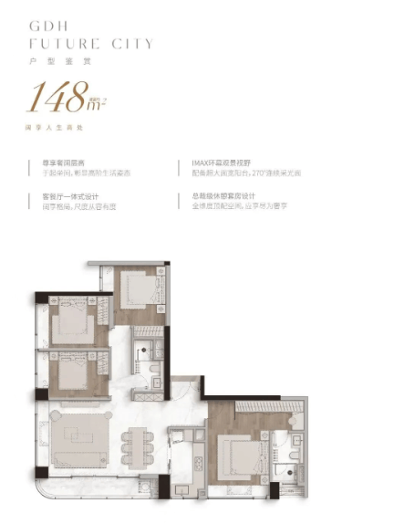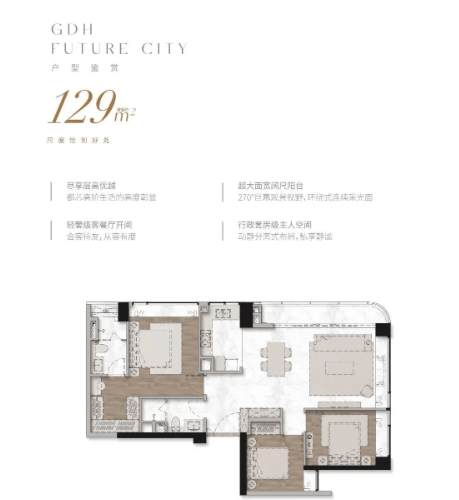 项目住宅产品分为两大系列:一是建面约140–264㎡的“现代美学大宅”,主打塔尖改善需求,空间尺度阔绰,强调景观视野与生活仪式感;二是建面约129–148㎡的“都芯轻奢私邸”,兼顾品质与实用性,满足高净值人群对核心区资产配置的需求。所有户型均按豪宅标准设计,注重通透性、采光面与功能分区,多数单位可望白云山景,东南北三向皆具山景资源,居住舒适度极高。