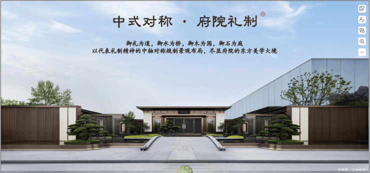项目整体建筑采用新中式风格,摒弃传统中式元素的堆砌,追求“骨相的中式”美学表达,将东方建筑的对称美学、留白艺术与现代建筑的简约质感相融,外立面选用温润的玉石、质感铜材与通透玻璃,搭配中式景墙与格栅设计,既彰显府院豪宅的气派,又蕴含岭南文化的细腻,实现传统文化与现代生活的共生共荣。