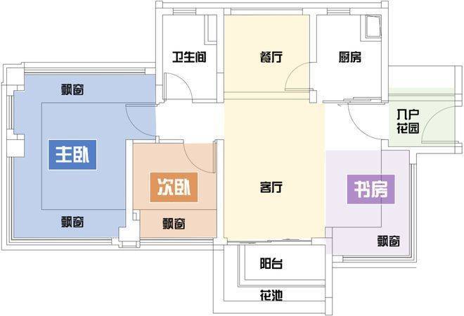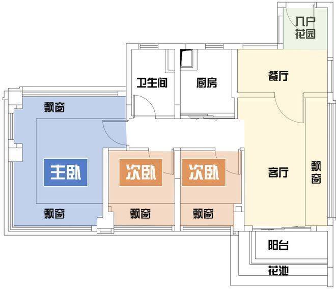 ②进阶格局:4.5开间朝南、南北对流、主卧270°环幕飘窗