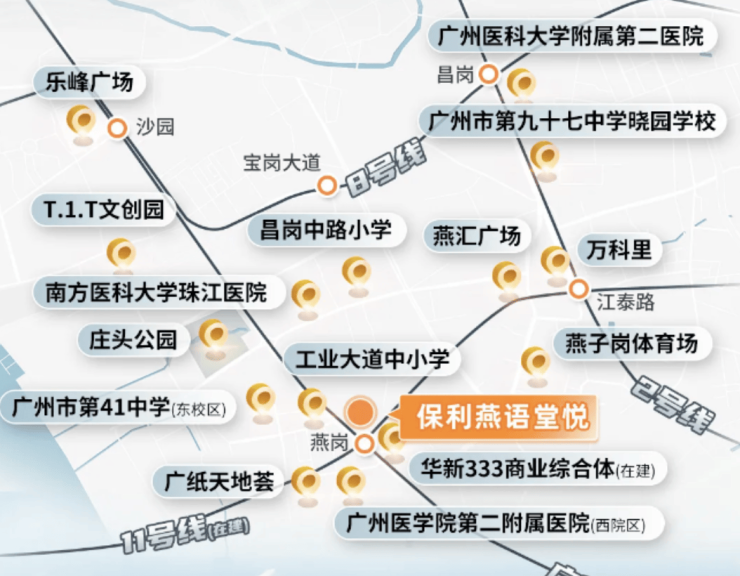 保利燕语堂悦位于海珠西板块,紧邻工业大道,属于海珠成熟的居住区。该区域交通便捷,配套完善,周边生活便利性高。海珠西板块作为广州中心城区的重要组成部分,兼具生活便利与城市发展潜力,周边三甲级医院、知名商业、教育资源密集。项目南侧靠近珠江后航道,部分高层户型可享受江景视野。地段优势在于成熟社区环境和潜在升值空间相结合,既满足日常生活所需,也具备长期资产保值价值。