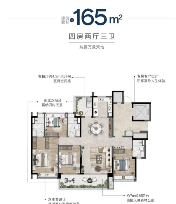 值得一提的是,项目采用两梯两户或两梯三户设计,梯户比极低,有效避免高峰期“等梯烦恼”,提升出行效率与私密性。主力户型建面约105-168㎡,均为四至五房改善型产品,空间格局方正,功能分区合理,低公摊、高得房率,兼顾舒适度与实用性。