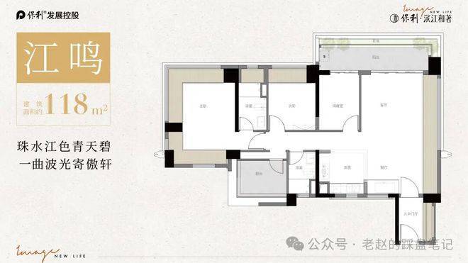 约118平方米四房两厅两卫户型强调景观与社交属性。约7米级阳台连接客厅与景观面,形成开阔观江界面。动静分区明确,卧室区域相对独立,保障私密性。创新“1+X”客厅设计可根据家庭结构进行延展,实现更大尺度公共活动空间。