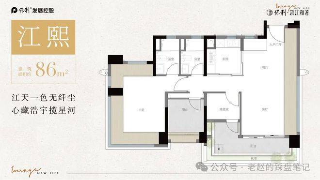约86平方米三房户型定位高性价比改善首选。客餐厅一体化布局形成开阔公共空间,南向大阳台面宽约6.4米,采光面充分展开。主卧配备L型飘窗,兼具观景与收纳功能。可变空间预留灵活布局可能,满足书房、儿童房或多功能区需求。