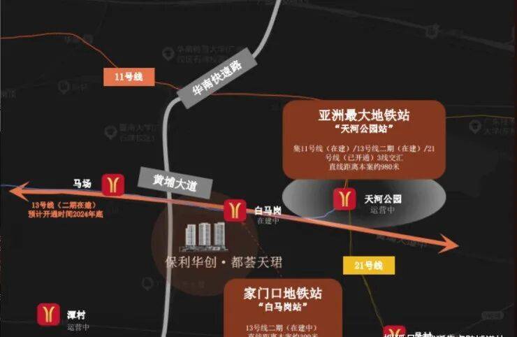 都荟天珺地处珠江新城东区,紧邻华南快速和黄埔大道交汇处,交通四通八达。三横三纵的主干道贯穿其间,无论是前往珠江新城、金融城还是其他城市热点区域,都能实现快速通行。此外,项目紧邻天河公园站和白马岗站两大地铁站,尤其是天河公园站作为三地铁交汇的枢纽站,未来出行将更加便捷高效。预计随着地铁11号线和13号线二期的建设推进,2024年底正式开通后,将进一步提升项目的交通优势。