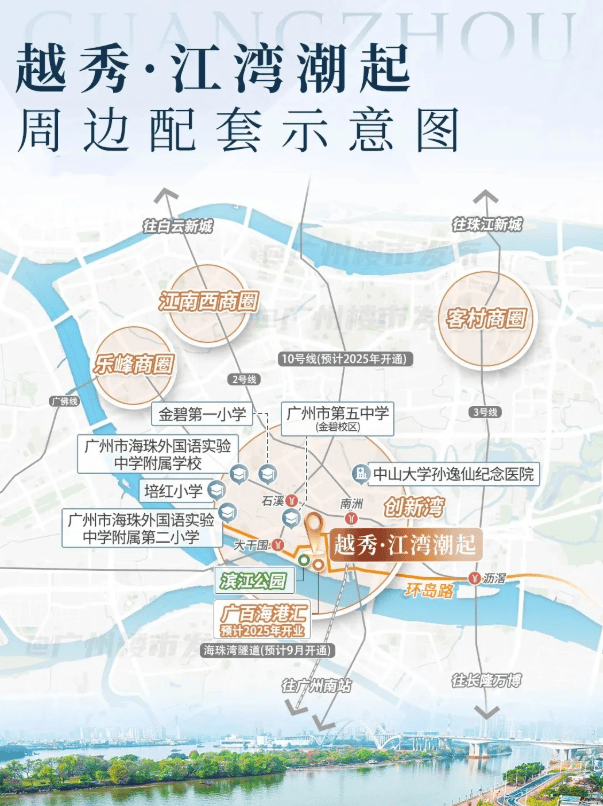 越秀·江湾潮起自带建面约3.4万平方米的商业Mall,计划引入奢侈品旗舰店、五星级酒店、商务办公等业态,未来将融合娱乐、休闲、体验、社交等全维度场景,带来宛如香港海港城的消费购物体验。广百海港城已于2023年12月12日正式封顶,预计今年底正式开业。周边商圈包括东晓南、江南西、乐峰广场等,满足日常购物需求。