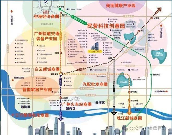 交通层面,项目周边已形成轨道交通与主干路网交织格局。地铁14号线太和站连接嘉禾望岗枢纽,换乘2号线、3号线等主线可通达广州南站、珠江新城、机场等核心区域。区域内规划与既有线路构成多线衔接格局,轨道交通在时间效率上提供明确支撑。自驾方面,新广从公路升级为双向六车道快速路,提升出行通达性。公交线路覆盖周边产业园区与居住社区,形成基础公共交通保障。