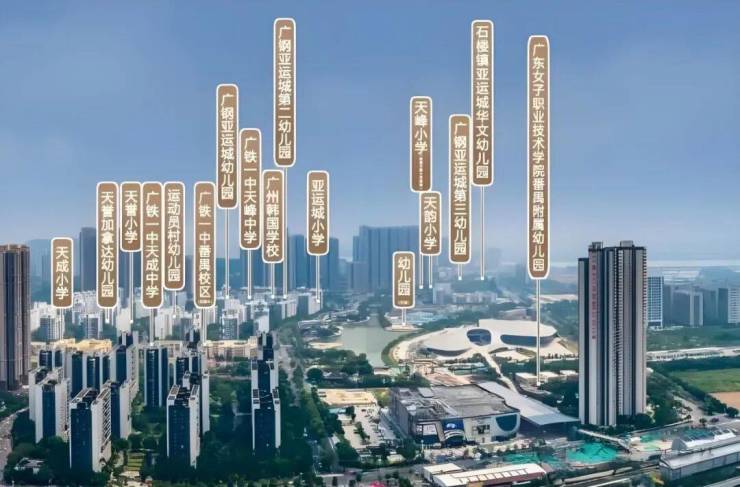 名校资源:4所省一级广铁一中分校中,天成校区2024年中考成绩位列番禺区属第一,高考高优率达93%。天际组团内规划1所幼儿园(已开学)及亚运城小学(可插班),初中大概率分配至铁一中学(人户一致优先)。