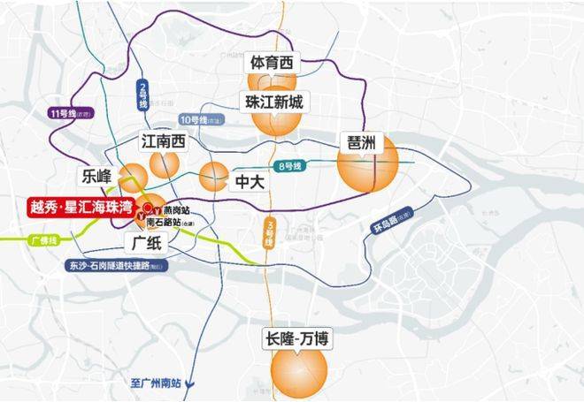 交通便捷是越秀・星汇海珠湾的一大亮点。广州 11 号线在建,贯穿项目,作为广州首条环城地铁,0 换乘就能直达琶洲、广州火车站、广州东站。距离广佛线燕岗站约 450 米,接入 3 号线后,7 站就能到珠江新城。而且海珠环岛路也在建设中,等建成后,交通便利性和区域价值都将大大提升,去哪都方便。