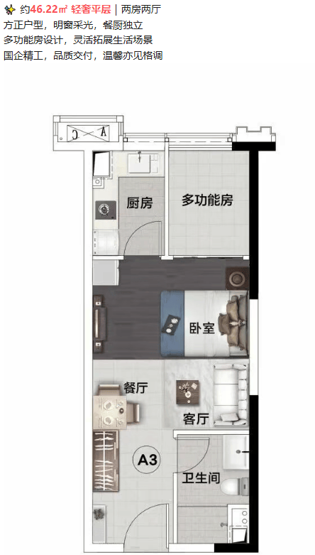 广州南站·广州足球公园主打[户型A]和[户型B]。以[户型A]90平方米三房两厅一卫为例,对比3年前同片区同面积段产品,在得房率上有了显著提升。3年前的产品得房率一般在75%左右,而[户型A]得房率达到了82%,这意味着实际使用面积增加了约7平方米。动线设计也更加合理,从入户玄关到客厅、卧室、厨房、卫生间的行走路线更加流畅,减少了不必要的迂回。功能空间上,增加了独立的储物空间,满足了家庭日常收纳需求;厨房采用U型设计,操作台面更宽敞,操作流程更便捷。
