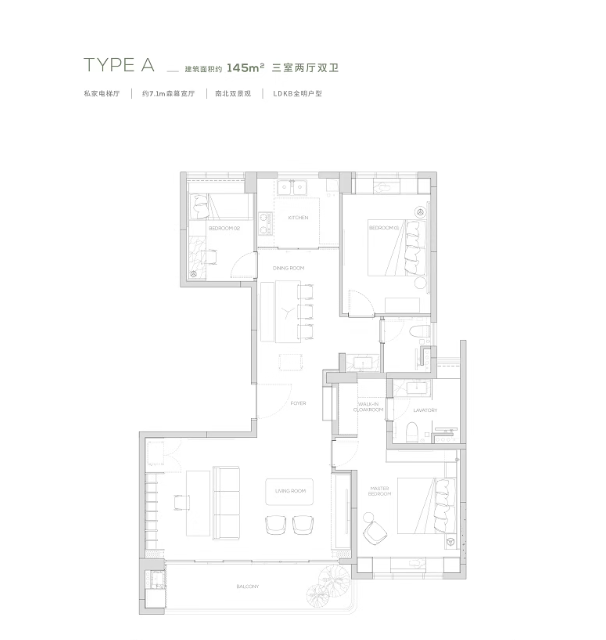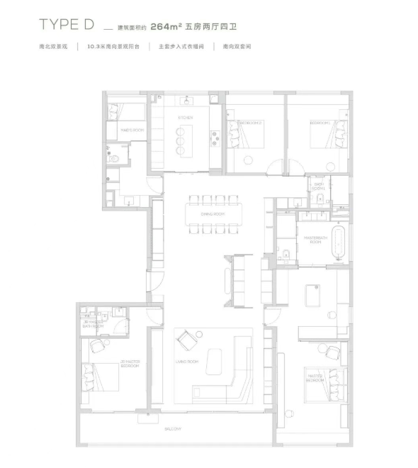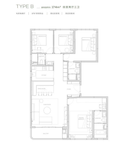 所有楼栋均采用南北通透的纯板式设计,主力户型为168㎡四叶草格局(四室两厅三卫),真正做到户户朝南、通风采光俱佳。项目配置2梯2户或3梯2户的专梯专户设计,极大提升了居住私密性与尊崇感,契合高净值人群对品质生活的极致追求。