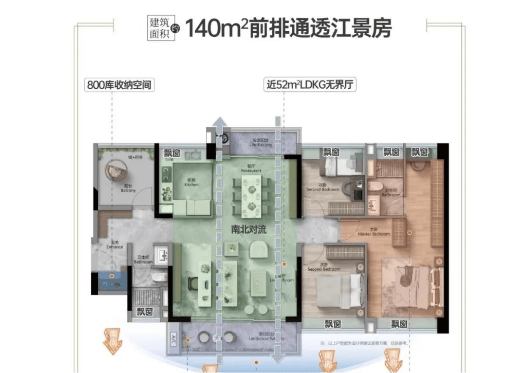 140㎡奢阔四房:打造双阳台+16米南向面宽,主卧带独立衣帽间与套房设计,居住舒适度拉满,面向高端改善客群。
