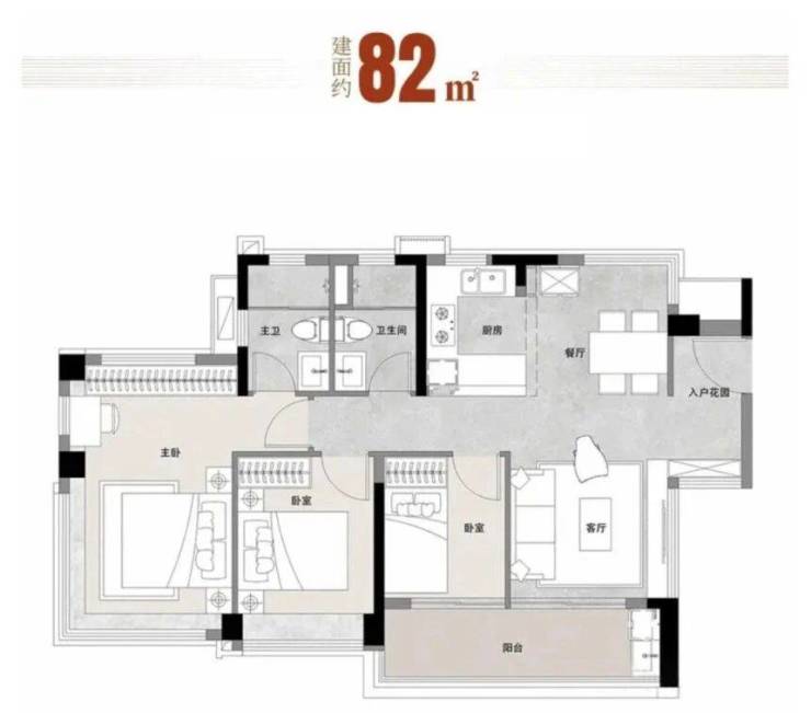 首先来看建面约82㎡的三房两厅一卫户型。这个户型堪称小户型中的“王者”,实现了四开间朝南的惊人布局,南向面宽达12米。这意味着,客厅、两个卧室以及阳台,全部朝向南方,享受着充足的阳光照射。6米长的超大阳台,连接着客厅与次卧,不仅扩展了室内活动空间,更提供了一个绝佳的观景平台。主卧采用三面采光设计,搭配L型飘窗,使得实际使用面积接近传统90㎡户型。这种设计,极大地提升了空间的利用率,让小户型也能拥有大宅的舒适感。