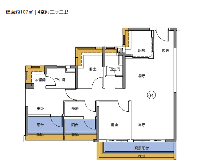 此户型延续了南向全明的优势,四开间朝南,采光通风极佳。约 107㎡的空间打造出四个功能空间,满足家庭不同阶段的需求。客厅与餐厅一体化设计,搭配景观阳台,增加空间开阔感,同时方便家庭聚会与休闲娱乐。主卧套间设计,配备独立卫浴和衣帽间,提升居住的舒适度与私密性。对于注重生活品质和空间利用的家庭而言,是理想的选择。
