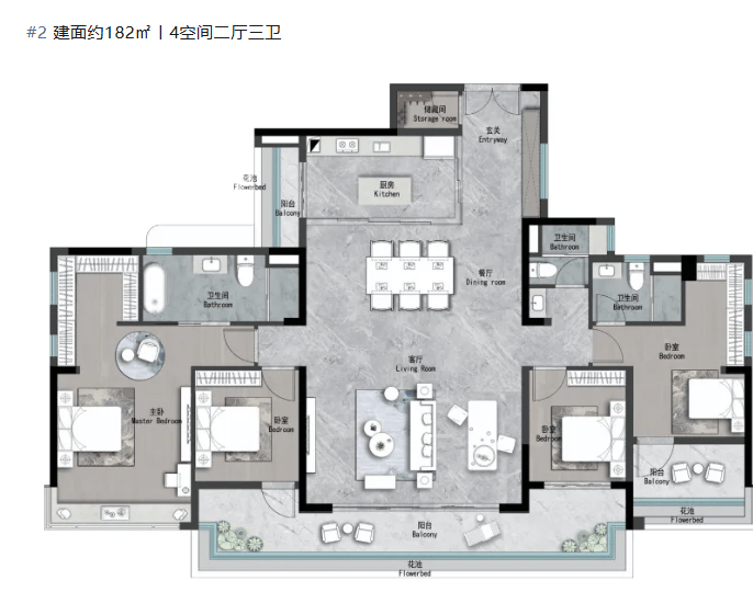 作为大户型产品,182㎡的空间尽显奢阔。四房设计,每个房间都宽敞明亮,可根据家庭需求进行个性化装修与布置。客厅空间极为开阔,搭配超大阳台,可将社区美景尽收眼底,是家庭休闲娱乐和社交的理想场所。餐厅可容纳多人用餐,适合举办大型家庭聚会。主卧配备豪华套间,包括独立卫浴、衣帽间和宽敞的休息区,270 度观景窗设计,让居住者享受极致的居住体验。此户型专为追求顶级生活品质的高净值人群打造,为他们提供尊贵、舒适的居住空间。