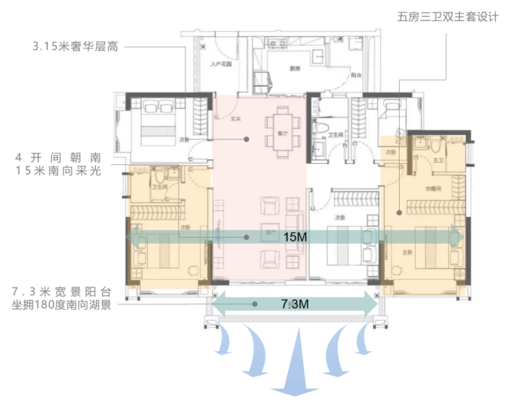 建面约162m²奢华五房:筑就建面约162㎡奢华湖景双主套五房,适配全龄段买家,一家三代人都能拥有相对独立的空间。
