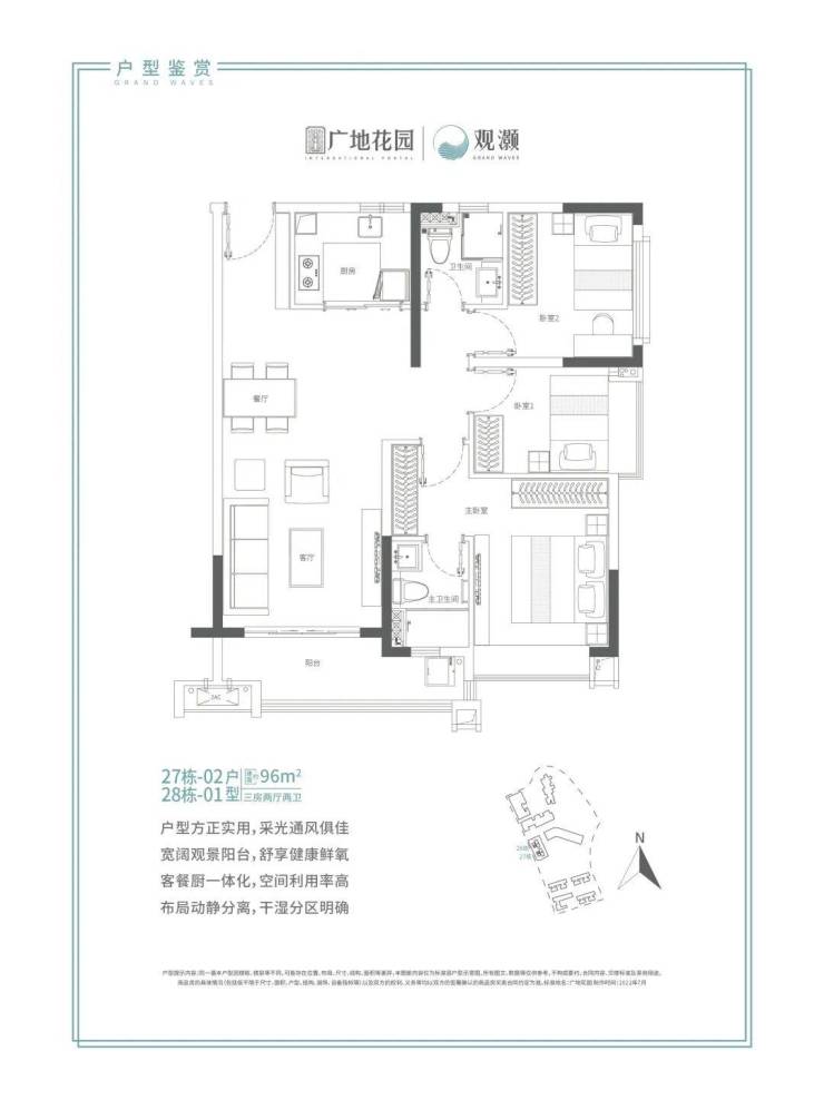 96㎡三房两厅两卫:户型方正实用,生活动静有序;带主套设计,客餐厨一体化,空间利用率高。
