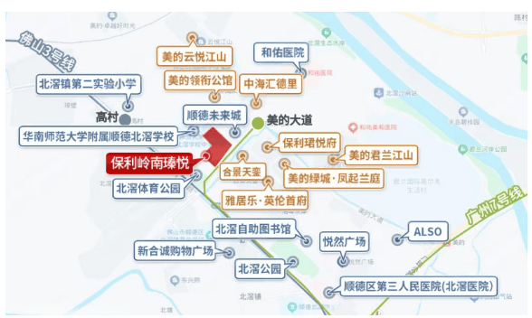 保利岭南瑧悦位于顺德北滘新城西部拓展区,具体位置在美的大道与碧桂路交汇处附近,与北滘体育儿童公园一路之隔,南侧为待开发地块,北侧紧邻中海汇德里公园街区,居住氛围已初步形成,又避开了老城区的杂乱与拥堵。