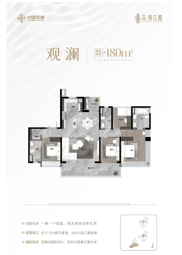 目前,中交四航·珠江春推出的户型主要集中在130-180平方米的大户型区间,适合追求舒适度和空间感的高阶人群。这些户型设计超越了传统产品的空间感和尺度感,旨在满足现代家庭对居住品质的高标准要求。通过精心的设计和布局,确保每一个细节都能体现出居住的纯粹性和舒适性。