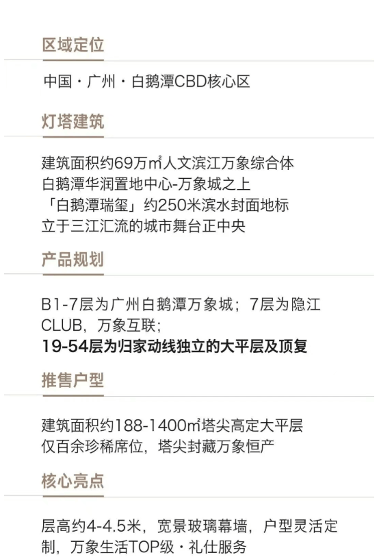 白鹅潭瑞玺坐落于中国南大门白鹅潭CBD,这里是广州城脉、商脉与文脉的交织之地,汇聚三江灵气。项目位置得天独厚,可正瞰白天鹅宾馆,于万象繁华之上欣赏烟火璀璨的城市美景。作为华润置地的战略级顶序作品,它承接了区域的深厚底蕴与发展潜力,为追求高品质生活的人群打造专属的居住体验。售楼处电话:提供购房咨询的联系方式400 - 828 - 5661