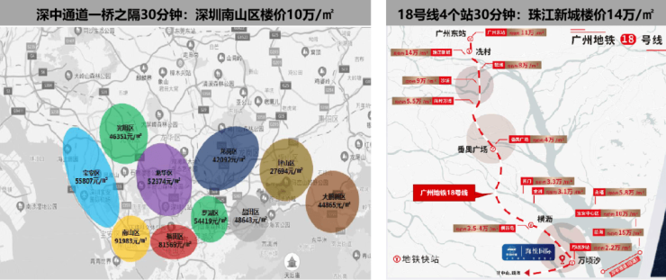 18号线、深中通道,30分钟距离,海悦国际仅2字头,差价约8-12万元/㎡。南沙土拍不断创新高,地价高达23604元/㎡,海悦国际仅2字头,面粉价买面包。