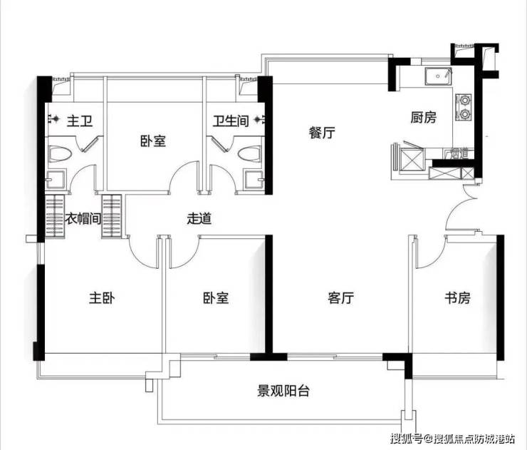 162㎡四房两厅:豪华主卧套房,独立衣帽间+双台盆卫生间,客厅开间超5米,可打造高端宴客空间。
