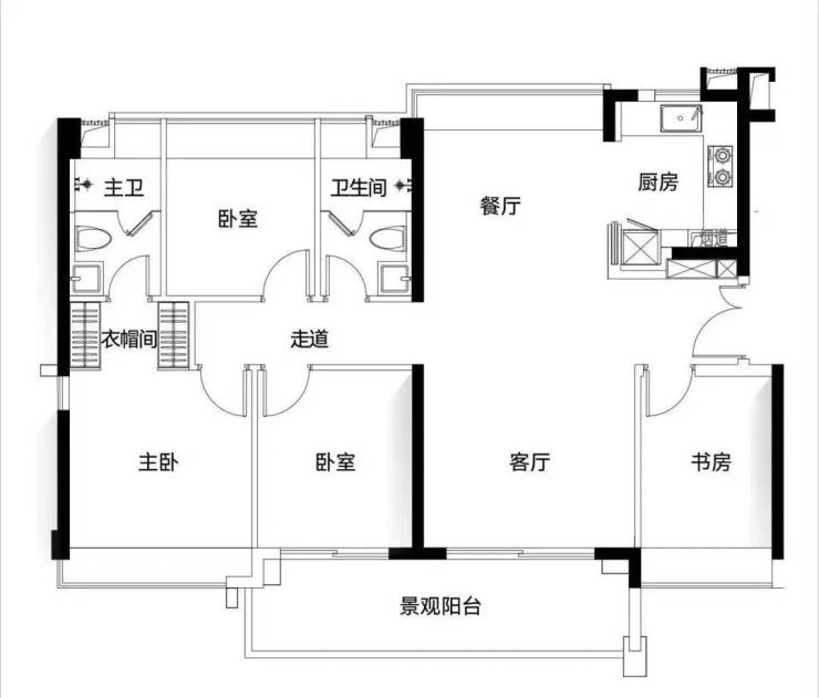 124平方米四房户型:在121平方米的基础上增加了生活阳台,并且景观阳台延伸至书房位置,进一步提高了居住舒适度。
