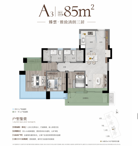 臻雲·建面约85㎡雅致清朗三居:该户型主打通透起居空间,盛载全龄愉悦生活。约100%使用率,打造阔绰3开间,保证室内充足的阳光与通风;采用LDKG创变宽厅设计,将客厅、餐厅、厨房、阳台融为一体,增强空间延展性,适合家庭聚会与日常互动;主卧配备270°无边观景飘窗,推窗即可欣赏山林与园林景观,提升居住质感。