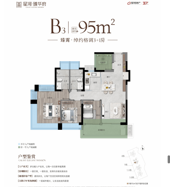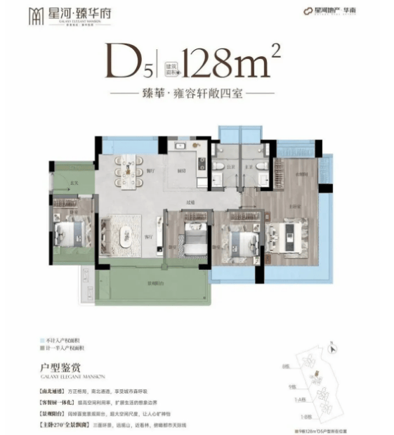 臻華·建面约128㎡雍容轩敞四室:灵性空间,更懂进阶人生所需。约100%使用率,配备迎宾入户花园,打造归家第一道风景,同时可作为收纳、绿植摆放空间,兼具实用性与美观性;宽幕景观阳台设计,视野开阔,可俯瞰社区园林与周边山体景观;主卧配备270°瞰景飘窗,搭配独立卫生间与衣帽间,彰显尊贵身份,满足高端改善家庭的居住需求。