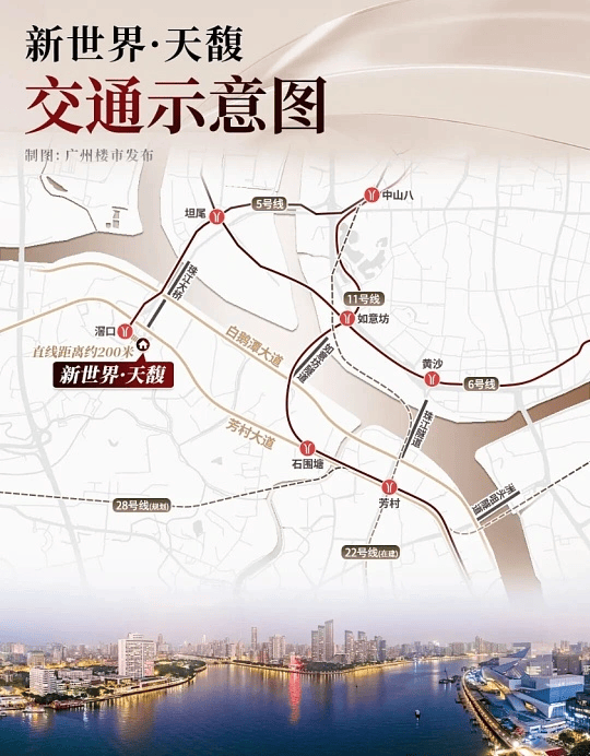 对于城市居住者而言,便捷的交通是平衡工作与生活的核心关键,新世界天馥立足白鹅潭 CBD 核心区位,打造覆盖地铁、主干道、隧道的多维立体交通路网,让业主日常通勤、跨城出行都能从容自在,彻底告别拥堵烦恼。项目步行即可抵达地铁 5 号线首发站点,作为广州贯穿东西的城市骨干地铁线路,5 号线无缝接驳珠江新城、金融城、琶洲等广州核心商务区,无需换乘即可快速通达天河、越秀、海珠等主城核心区域,日常通勤高效便捷。更值得一提的是,作为地铁 5 号线首发站点,业主无需担心早高峰无座的尴尬,每天都能以舒适松弛的状态开启通勤之路。除了 5 号线之外,项目还可快速接驳地铁 6 号线、11 号线等已开通线路,未来更有地铁 22 号线、28 号线规划加持,地铁路网将持续完善,出行效率进一步提升。自驾出行同样便捷无忧,项目周边环绕如意坊隧道、珠江西桥、洲头咀隧道、聚龙湾隧道等多条城市核心通道,可瞬联珠江一江两岸,畅达广州四大核心城区;白鹅潭大道直达片区重奢商业集群,无论是日常通勤、周末出行,还是跨城短途自驾,都能轻松实现繁华与静谧的自由切换。