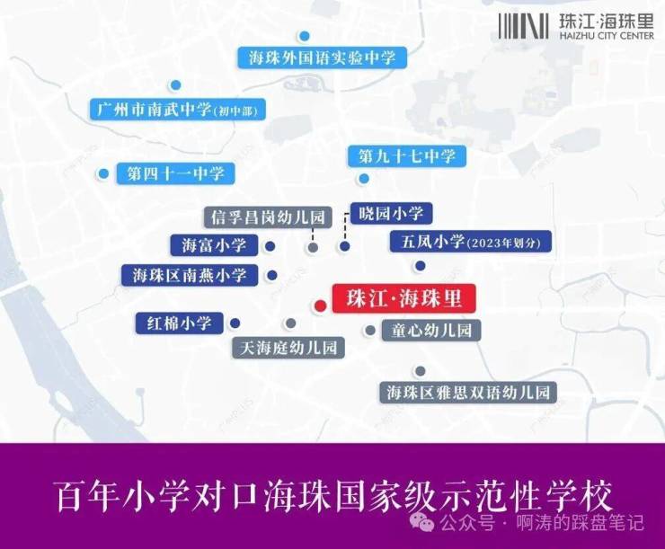 1公里内超12所公立学校环伺,根据2023年招生文件指引,百年老校五凤小学的对口中学有9家,包括:南武中学校本部(国家级示范性学校)、第九十七中学(省一级)、海珠外国语实验中学(省一级)、第四十一中学校本部(省一级)等。