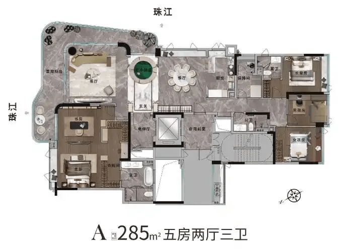 对于追求更开阔空间、更极致江景体验的家庭来说,285㎡的五房户型绝对是不二之选。这款户型堪称“江景豪宅的天花板”,无论是空间尺度还是景观视野,都达到了顶尖水平。