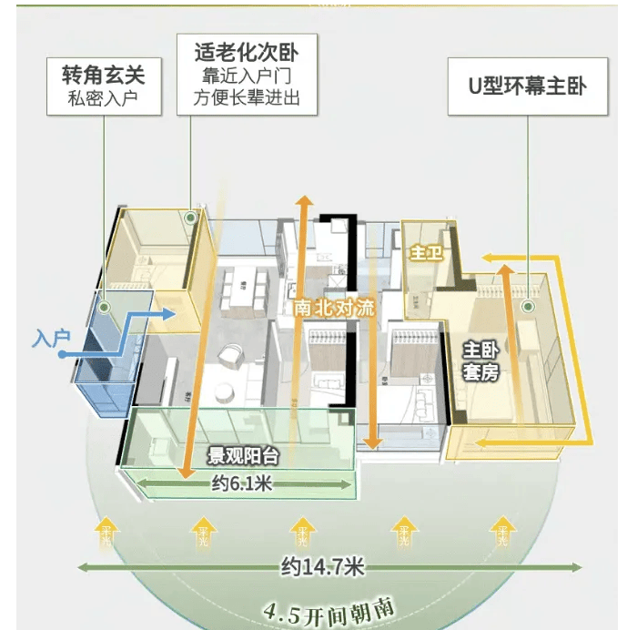 户型亮点:约5.4米景观阳台,推窗即望17万方晓港公园绿意,视野开阔;U型环幕主卧,采光通风俱佳,提升居住舒适度;全卧室南向归置,厨房、卫生间功能区北向归置,家庭动静秩序感更强。