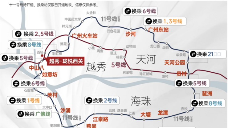 项目最吸引年轻购房者的因素之一,莫过于交通即达性。步行即可到达轨道交通枢纽,是内城项目的终极竞争力。越秀珑悦西关距离地铁5号线及11号线中山八站约1公里,同时还可利用在建的13号线二期西场站,构成了“三线可达”的高密轨道出行体系。5号线贯穿广州南北主轴,11号线更是广州首条超级环线,覆盖白鹅潭、中大、琶洲、天河公园、广州东站等核心功能区,让城市跨区通勤不再依赖换乘,效率大幅提升。