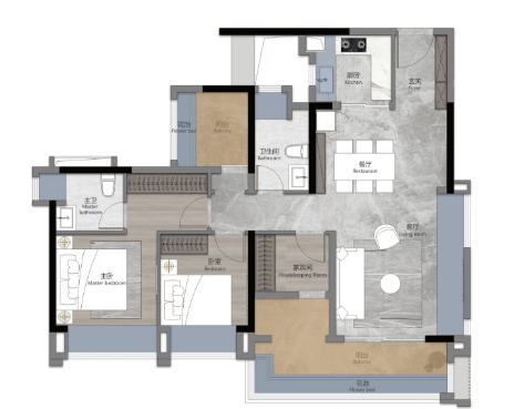 约119㎡四房两厅两卫:南望园林,北望白云湖,超长私密玄关入户,全景主卧套房。