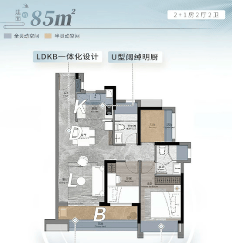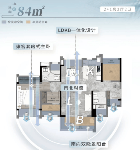 约84㎡三房两厅两卫:南向双瞰景阳台,U型明厨,阔绰套房式主卧,南北对流设计。
