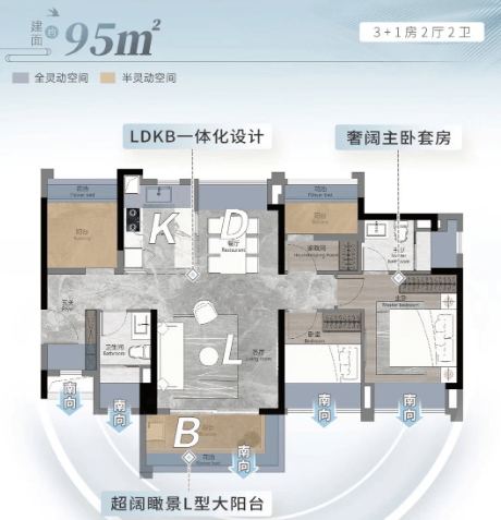 约95㎡四房两厅两卫:五开间朝南,超阔瞰景阳台,南北对流设计,奢阔私密主卧套房。