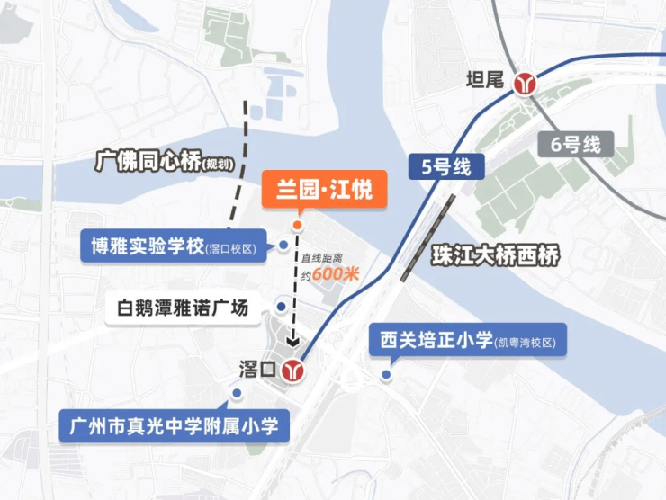 交通出行同样便捷。项目紧邻5号线滘口站,步行约1公里即可到达,轻松通达广州各核心区域;一墙之隔便是星河江缦及二手豪宅珠江鹅潭湾,周边路网成熟,自驾出行畅通无阻;规划中的广佛同心桥,将直通佛山地区,白鹅潭大道可通往广船、医药港等地,未来随着22号线、佛山经广州至东莞城际等线路的完善,将实现1小时内湾区互联互通,出行更加便捷高效。