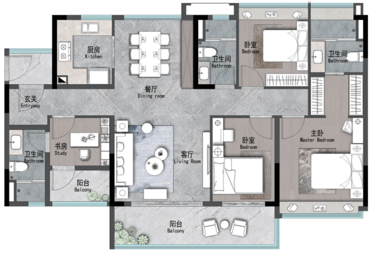 128㎡ 四房:8米L型阳台,南北通透,双主卧套房设计,满足二胎家庭或多代同堂需求。