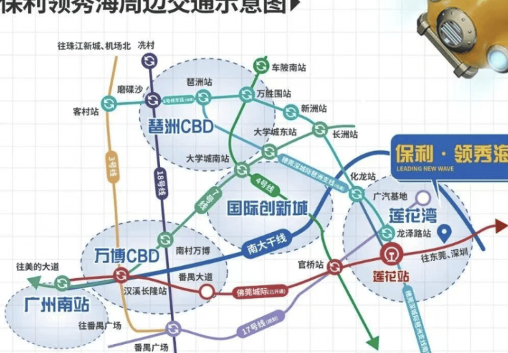 保利领秀海位于广州市番禺区莲花湾板块,地处《广州市十四五发展规划》中明确的“第三科技创新轴”核心区,规划千亿级新能源产业集群,未来导入超2万高新人才。项目距南大干线仅750米,双向8车道快速路接驳新化快速,自驾25分钟直达琶洲、万博CBD,30分钟通达珠江新城。根据广州市交通局规划,地铁8号线东延段(2027年通车)7站至万胜围,佛莞城轨(已开通)3站直达万博、4站至广州南站,形成“五轨交汇”立体交通网。
