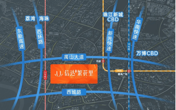 信达・繁花里虽步行约 1.7km 到市桥地铁站,但 1 站长隆或番禺广场,可换乘 7 号线快速抵达万博、海珠、珠江新城等地,并能任意接驳 18/22 号线。规划中的 26 号线有望在附近设站,届时将成为地铁上盖物业。此外,临近禺山大道、西环路两大主干道,接驳东新高速、新光快速,可通达全城。