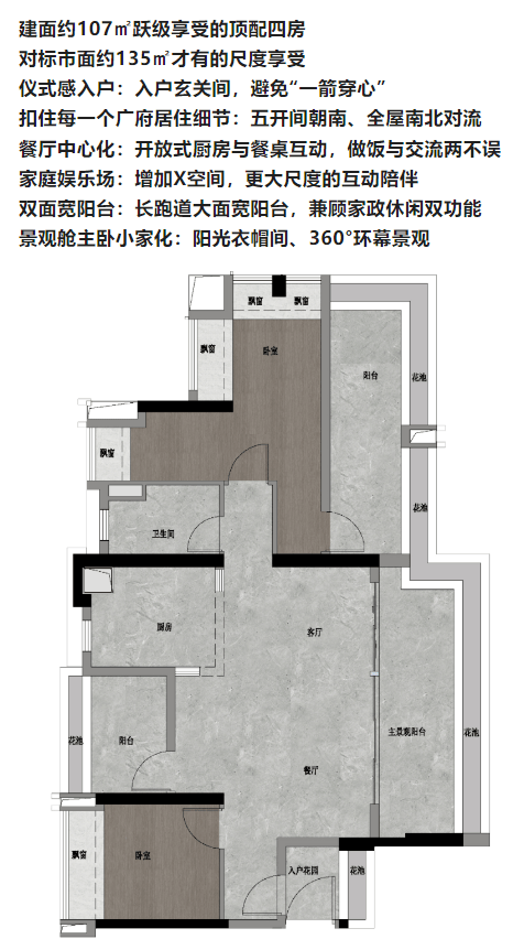 建面约 107㎡户型:跃级享受的顶配四房,对标市面约 135㎡才有的尺度。仪式感入户,设置入户玄关间,避免 “一箭穿心”。五开间朝南、全屋南北对流,保证室内空气流通和充足采光。餐厅中心化,开放式厨房与餐桌互动,方便做饭时与家人交流。增加 X 空间,打造更大尺度的家庭娱乐场,增进家人间的互动陪伴。双面宽阳台,长跑道大面宽阳台兼顾家政休闲双功能。景观舱主卧小家化,配备阳光衣帽间、360° 环幕景观。