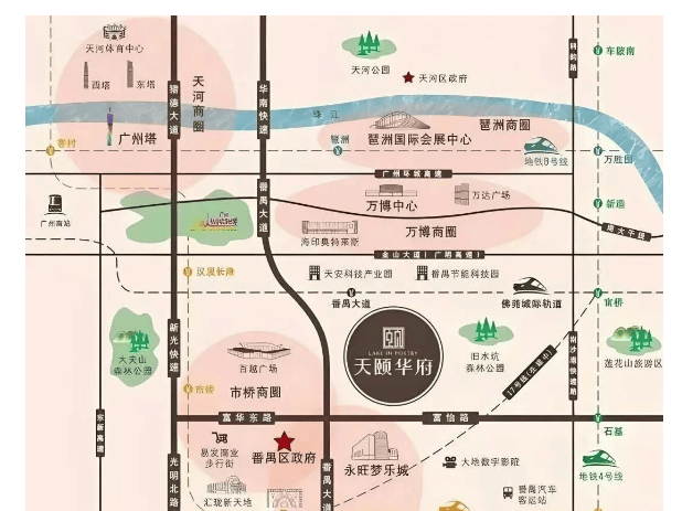 天颐华府坐落于广州市番禺区的核心地带——番禺广场板块,这里四条地铁线交汇(3号线、18号线、22号线和17号线),形成了枢纽级交通中心。通过“五纵三横”的立体路网,仅需25分钟即可抵达珠江新城CBD国际生活圈。此外,项目周边商业设施齐全,距离区政府千亿商圈仅5分钟车程,附近有永旺梦乐城、基盛万科中央公园等大型购物中心;而市桥的易发商业街、钻汇广场也在10分钟车程范围内。