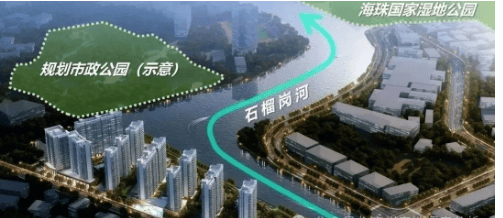 项目地处海珠琶洲 CBD 板块,地理位置优越,西侧为广州海珠湿地公园,南侧邻石榴岗河,拥有稀缺的滨水资源和良好的生态环境,居住舒适度高。